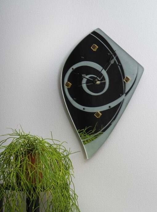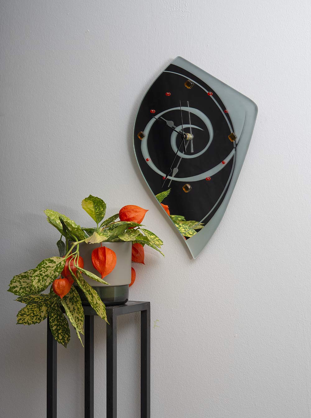 Orologio/Specchio da parete personalizzabile, dalla forma giocosa ed elegante, con una sabbiatura ispirata alla forma della spirale, arcaico simbolo che rappresenta l’infinito, la continuità del ciclo della vita e la rinascita. I piccoli vetri in fusione applicati rendono al contempo immediata la lettura dell’orologio e ne definiscono il ricercato design. Elemento d’arredo perfetto per ambienti sia classici che moderni. Su ogni orologio possiamo incidere a mano libera nome, data o dedica personale.